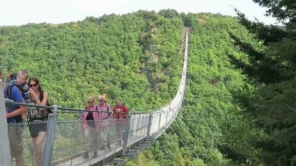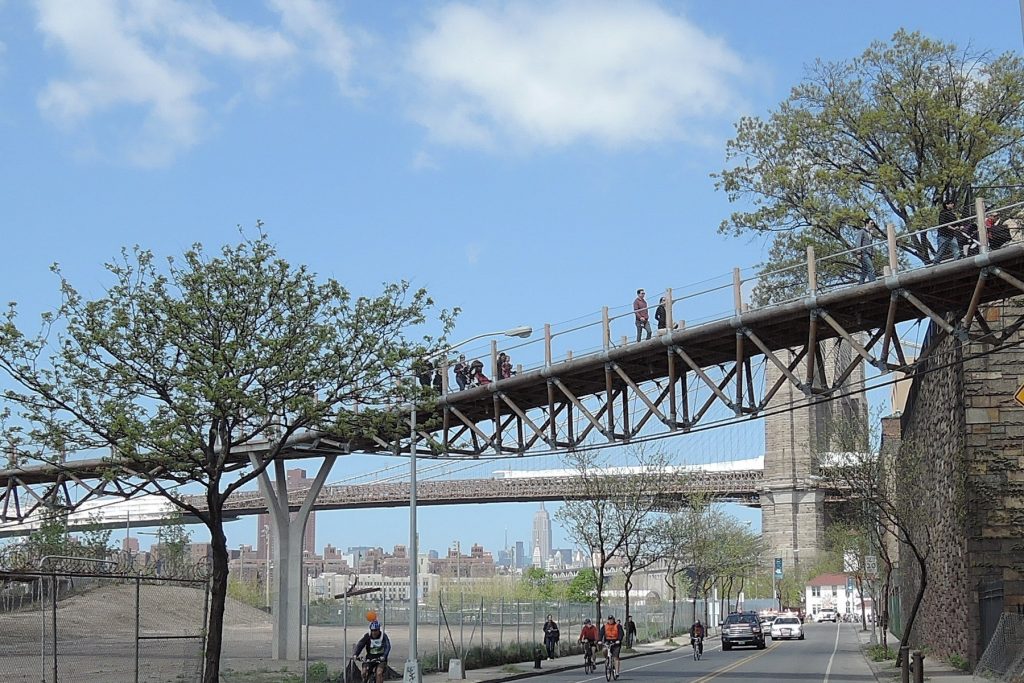 un descendiente de principios del siglo XIX del simple puente colgante. La plataforma se eleva en postes encima de los cables principales.