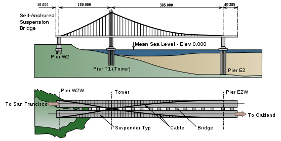 un descendiente moderno del puente colgante, que combina elementos de un puente atirantado. Los cables principales están anclados a los extremos de las cubiertas.